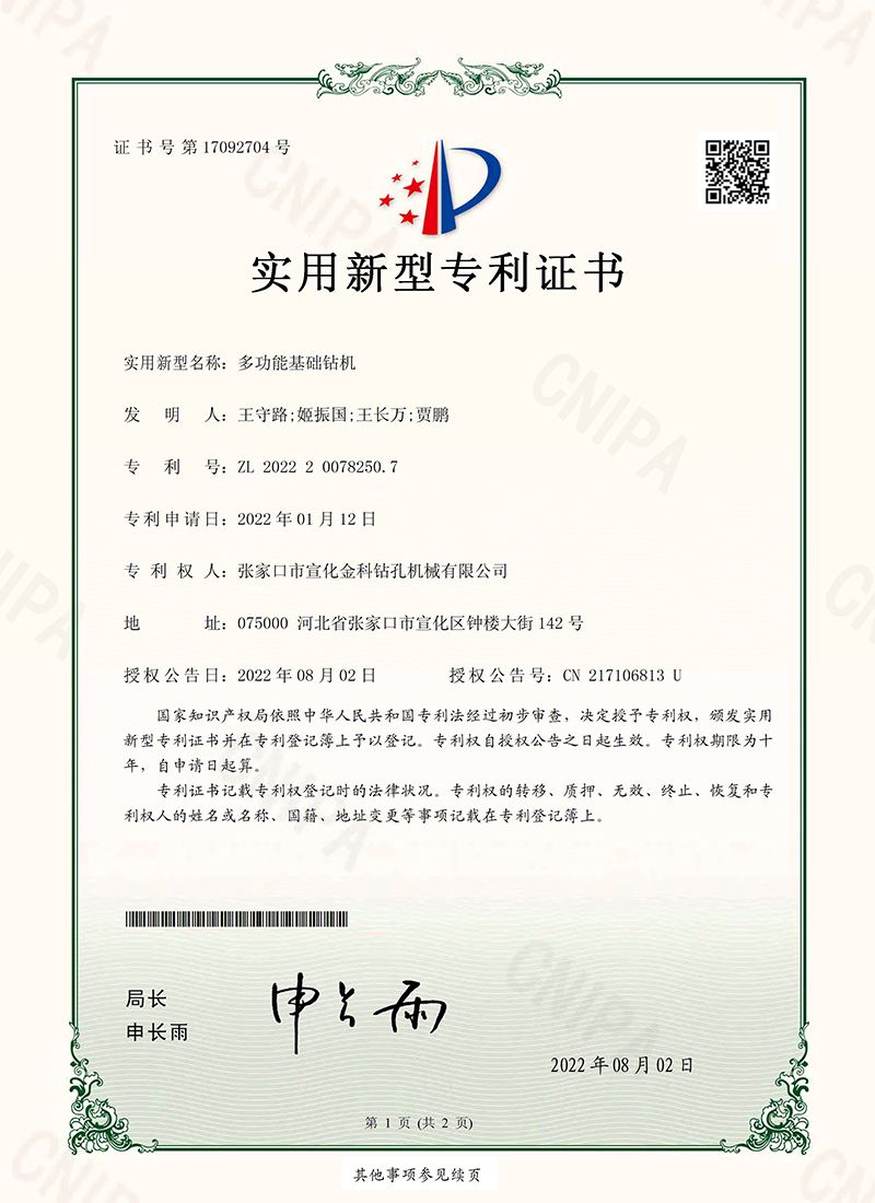 شهادة براءة الاختراع - جهاز الحفر للأساسات متعدد الوظائف