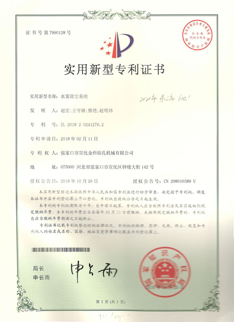 شهادة براءة اختراع - نظام إزالة الغبار برش الماء